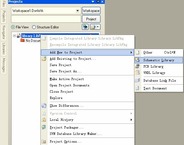 2. 在project 标签右键点击project 名,在弹出的菜单中选择增加原理图库。(图2)并命名保存。
