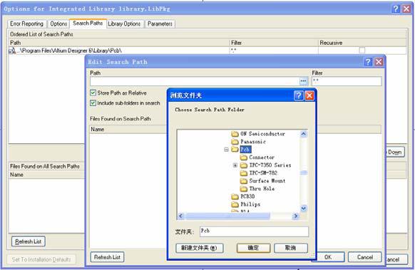 5. 在为符号元件建立模块联接之前,先建立查找路径。选择Projectproject Option…,进入project 属性对话框,在Search Paths 页添加模块路径。Footprint库在Altium Designer 6 libraryPCB 路径下。为了防止查找范围过大,一般“include sub-folders in search” 不选中。然后点击 “refresh list” 按钮。如图5