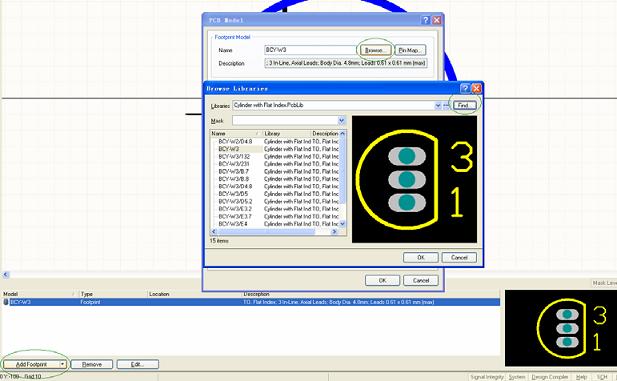 点击shclib 界面下左下角Add Footprint,进入增加元件封装界面,运用Browse 按钮选择Cylinder with flat index.pcblib 下的BCY-W3 封装。也可以使用Find 按钮来查找所需要的封装。点击OK,这样封装模块就加载好了。如图6