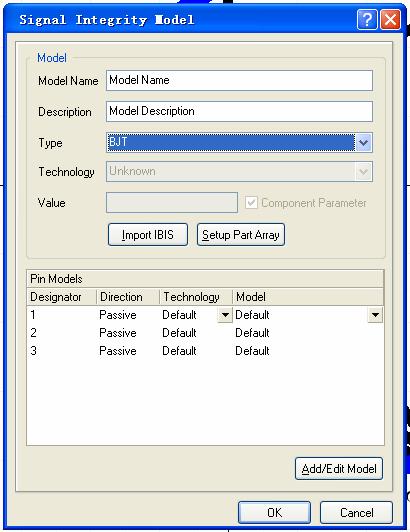 选择 “Add signal integrity” 打开对话框,在“type”处选择“BJT”类型,其他可以选择默认值,也可以运用 “import IBIS”按钮导入文件模型。点击OK。 同上可以增加3D 模型,3D 模型文件格式是*.VRML,*.IGES.