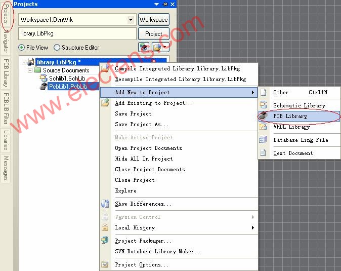 1. 在project 标签中,右键点击library.libpkg,选择add new to projectpcb library,增加一个pcb 库并命名保存为pcblib1.pcblib。如图10