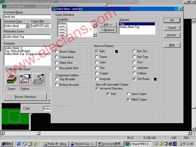 5. 若零件pad是由pad与copper作associate,在出底片作cam 时应在solder mask选择Top 'pin with associate copper'advanced selsction'pads 'filled copper