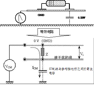 从图1中还可以看出,CP1:(放电点与GND之间的寄生电容),Cp2:(PCB板与参考接地板之间的寄生电容),PCB板的工作地(GND)和静电放电枪(包括静电放电枪接地线)一起形成了一条干扰通路,干扰电流为ICM。在这条干扰路径中,PCB板处在其中,显然PCB在此时受到了静电放电的干扰。如果该产品还存在其它电缆,这种干扰讲更为严重。