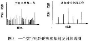 首先,应努力控制信号与瞬态电源电流形成的每一个环路面积,使其最小,特别是作为主要辐射源的传输系统时钟电路。时钟信号通常也是系统中频率最高的信号,其所有能量都集中在基波与其谐波组成的窄频带内,因此,所有时钟线都应该有毗邻的地回流线,这样就能够使总时钟环路面积小于几平方厘米。图2是一典型的计算装置产生的辐射发射频谱图,虽工作条件不同,但其最大发射几乎相等。