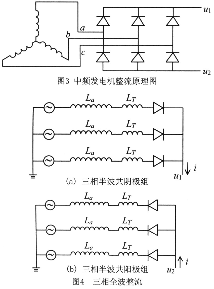 图3是中频发电机整流原理图,图4为三相全波整流电路,其中(a)为三相半波共阴极组,(b)为三相半波共阳极组,二者的串联即为图3的等效电路。