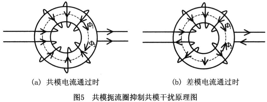 共模扼流圈的原理是流过共模电流时磁环中的磁通方向相同(磁通方向根据文献[4]判别),因而相互叠加(φ1+φ2),从而具有相当大的电感量,对共模电流起到抑制作用(图5(a)),而当两线圈流过差模电流时,磁环中的磁通方向相反,因而相互抵消(φ1-φ2),几乎没有电感量,所以差模电流可以无衰减地通过(图5(b))。因此共模电感在平衡线路中能有效地抑制共模干扰信号,而对线路正常传输的差模信号无影响。对于中频发电机输出来说,任何时候电源线之间的电流都是大小相等,方向相反的(图5(b)),磁芯中的磁通相互抵消,线圈不呈现阻抗,避免了检测装置发射机高压供电工作时因为滤波器的引入而在电源端产生附加的压降。由此分析得出,在中频发电机供电输出端接入共模扼流圈,能够抑制电源线上供电回路的共模干扰,而对供电电流不起任何阻碍作用,可以无损耗地传输。