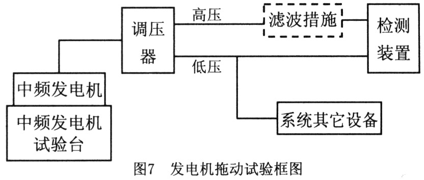 发电机拖动试验验证系统在中频发电机供电下,检测装置采取滤波措施前、后接收通道的噪声情况比较。试验框图见图7所示。