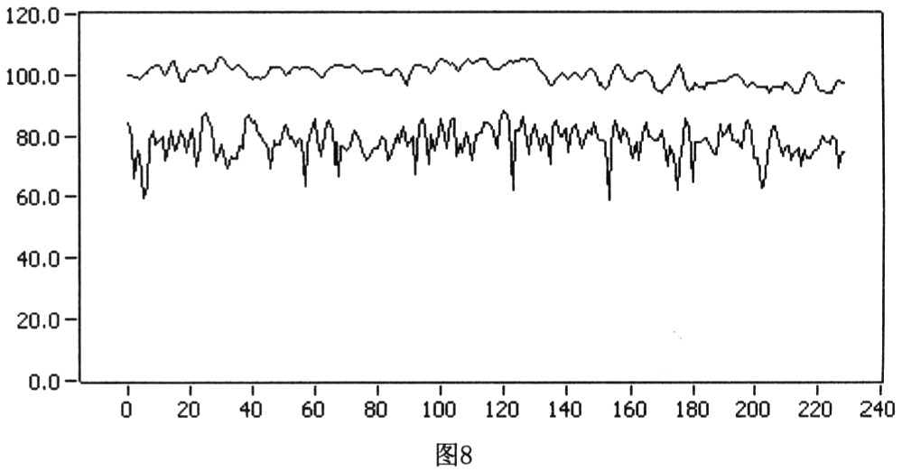 在无滤波措施的情况下,实际装载试验时检测装置工作在恶劣环境下。由于长期以来的认识误区,并没有意识到中频发电机的电噪声是检测装置的主要干扰源,导致检测距离严重不足。因而设法采取了其它各种降噪声措施,但收效甚微。图8是在发电机噪声干扰情况下,实际装载试验时目标出现在远距离的检测结果,横坐标为该距离下的频率点,纵坐标为检测值与门限值的幅度,信号应出现在140的频率点附近,由于噪声太大,信号完全被淹没在噪声中,检测装置不能够发现目标。