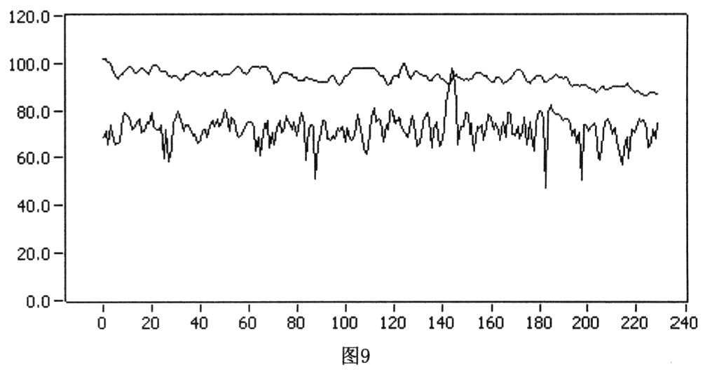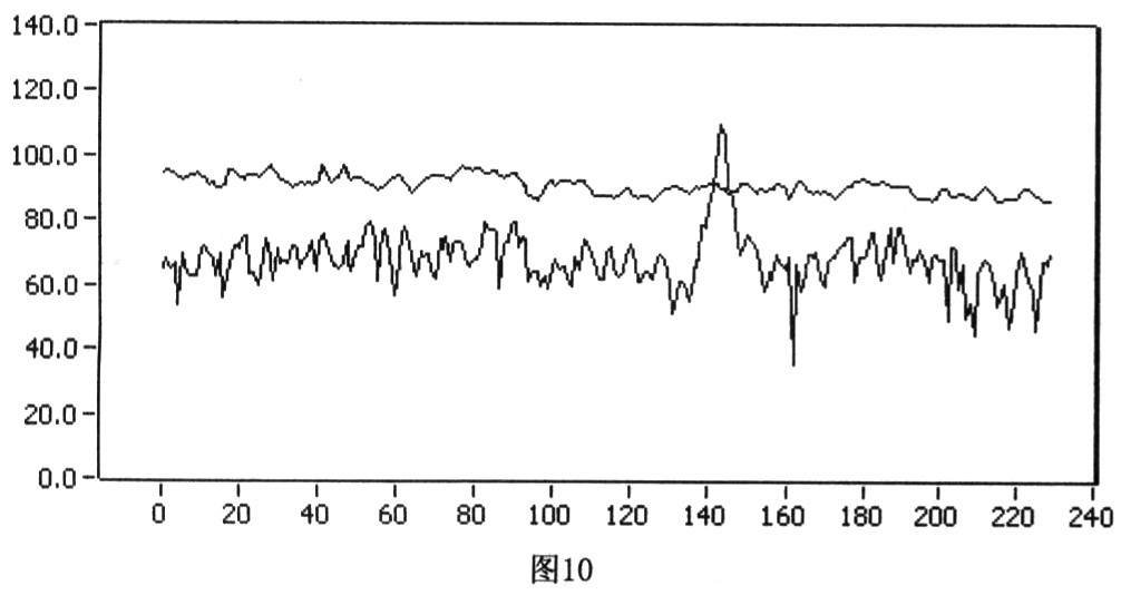 图9是发电机噪声干扰情况下,实际装载试验时目标已出现在较近距离时的检测结果。此时随着检测装置与目标之间的距离接近,信噪比逐渐增大,信号已超过了门限值,检测装置发现了目标。但是探测距离极为有限。