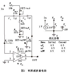 滤波器电路如图2所示。优化目标要求中心频率(Fc)为10Hz;3dB带宽(BW)为1Hz,容差为10%;增益(G)为10,容差为10%。