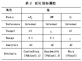 调用Pspice A/D进行模拟计算,在相应窗口中显示中心频率的值为8.3222,带宽为0.712187,增益为14.8106。显然这与要求的设计指标有差距,需要通过优化设计达到目标,具体设置见表2。