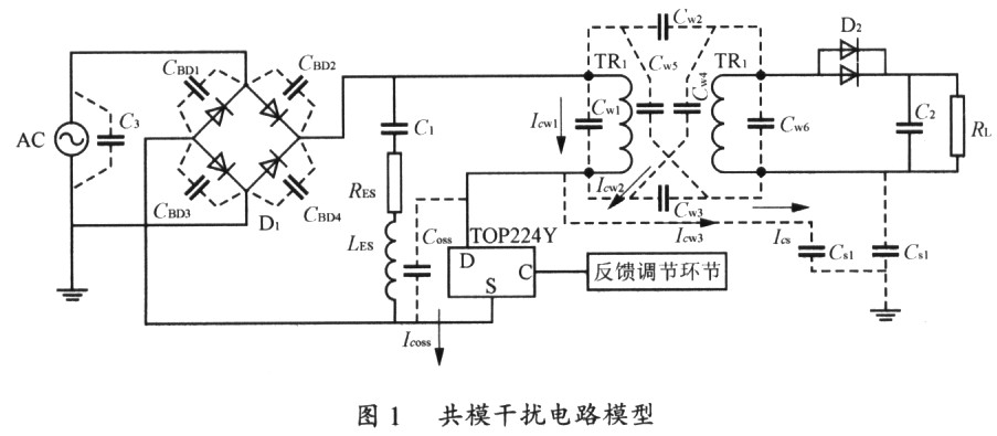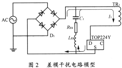 单片开关电源的集成度很高,已经通过合理的设计将引线电感和寄生电容参数减小到比较小的水平。电路的共模电磁干扰主要是漏一源电压和输出整流管反向恢复过程产生的,由于高频变压器的分布电容以及芯片对地分布电容的影响,高频电流不能完全抵消,形成共模干扰,其电路模型如图1所示。这种共模干扰可以通过EMI滤波器的共扼电感和Y电容提供高频电流对地泄放通道进行抑制。差模干扰电路模型如图2所示,也可以通过EMI滤波器的X电容进行抑制。