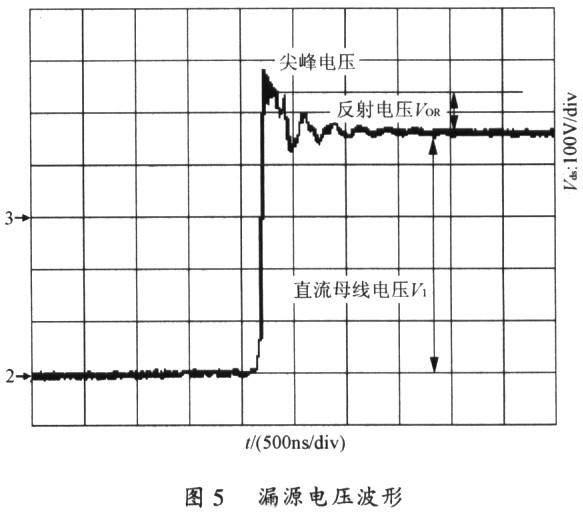 二极管导通时,在P区和N区分别有少数载流子电子和空穴导电,当突然加反向电压时,存储电荷在反向电场作用下被复合,形成反向恢复电流。由于变压器次级漏感、引线电感及二极管的结电容,在关断电压上叠加了一个衰减振荡电压,形成了关断电压尖峰,如图5所示。对此可以通过外接RC吸收电路抑制二极管电荷存储效应所产生的浪涌电流。