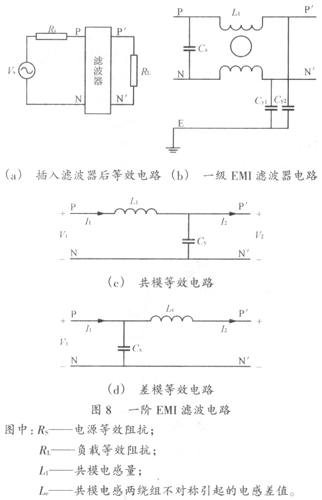 一般开关电源与电网直接相连,高频开关的两端产生浪涌电压,流过一定的浪涌电流,这个电流通过高频变压器原边、直流电容和开关器件形成回路,产生高频辐射干扰;同时高频电流流过一次侧整流电路,产生的脉冲电压叠加在电网电压上,形成差模干扰,对同一线路上的其他设备带来干扰。如图8所示,在开关电源的电源输入端安装电源滤波器可以起到抑制共模和差模干扰的作用。