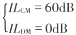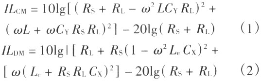 按前文的分析,理想EMI滤波器应使共模插入损耗(ILCM)最大,而差模插入损耗(ILDM)最小,从图6可以看出,EMI滤波器在10MHz时噪声超出标准最大,达到35dB左右,所以,共模噪声的衰减必须达到40dB,设计时令Rs/RL=50Ω/50Ω,衰减损耗按60dB设计,则有