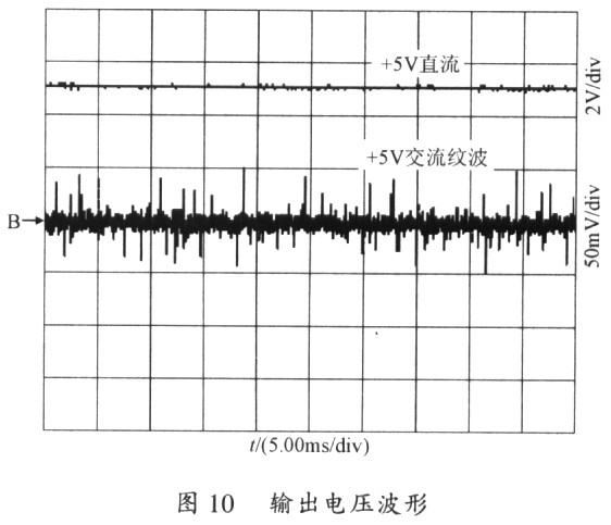 经过以上EMC优化设计,基于TOP224Y设计的的反激变换电路实现输出电压调整率△Vo/Vo=0.1/5=2%(主输出+5V,满载20W,连续72h带载),达到了预期设计的要求。图10是输出电压直流分量与其交流分量波形。