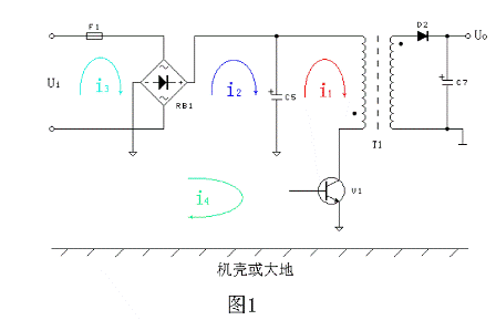 图1 中,当电源开关管V1导通或者关断时,在电容器C5、变压器T1的初级和电源开关管V1 组成的电路中会产生脉动直流i1,如果把此电流回路看成是一个“变压器”的“初级线圈”,由于电流i1 的变化速率很高,它在“初级线圈”中产生的电磁感应,也会对周围电路产生电磁感应,我们可以把周围电路都看成是同一“变压器”的多个“次级线圈”,同时变压器T1 的漏感也同样对各个“次级线圈”产生感应作用,因此电流i1 通过电磁感应,在每个“次级线圈”中都会产生的感应电流,我们分别把它们记为i2、i3、i4 •••。