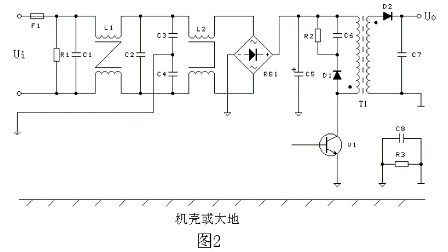 图1 是一个普遍应用的反激式(或称为回扫式)开关电源工作原理图,50Hz 或60Hz 交流电网电压首先经整流堆整流,并向储能滤波电容器C5 充电,然后向变压器T1与开关管V1组成的负载回路供电。图2 是进行过电磁兼容设计后的电原理图。