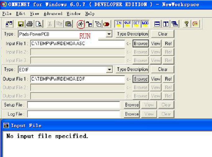2.启动程序 Omninet for Windows,输入文件类型(Type)选 Pads-PowerPCB,Input File 1里用 Browse 指定网络表文件的位置。