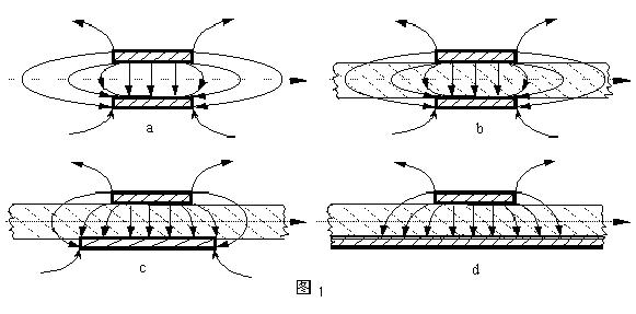 微带线是由微波双线在特定条件下的具体应用。图1-a. 即为微波双线及其场分布示意图。在微波级工作频率的PCB 基板上,可以构成常规的异面平行双线(图1-b.所示)或变异的异面平行双线(图1-c.所示)。当其中一条状线与另一条状线相比可等效为无穷大时,便构成典型的微带线(如图1-d.所示)。从双传输线到微带,仅边缘特性改变,定性特征基本一致。