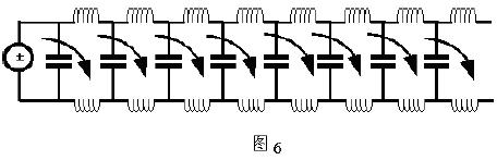 图3所示的PCB条状双线等效电路中,在直流电源接入瞬间,从左到右,电压和电流是以依次向相邻电容充电,然后向次级电容放电的过程形式传播的,称为电流行波。