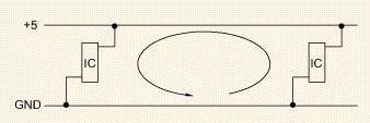 电流通过感应进入到电路环路,这些环路是封闭的,并具有变化的磁通量。电流的幅度与环的面积成正比。较大的环路包含有较多的磁通量,因而在电路中感应出较强的电流。因此,必须减少环路面积。