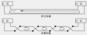 如图6所示,将每个敏感元件的长信号线(>30厘米)或电源线与其接地线进行交叉布置。交叉的连线必须从上到下或从左到右的规则间隔布置。