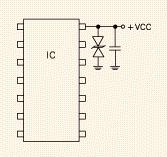 ESD对地线层的直接放电可能损坏敏感电路。在使用TVS二极管的同时还要使用一个或多个高频旁路电容器,这些电容器放置在易损元件的电源和地之间。旁路电容减少了电荷注入,保持了电源与接地端口的电压差。