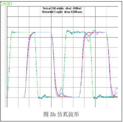 图3a 构建了三种源端匹配结构,类似于终端匹配的情形,这三种结构分别为匹配电阻直接与接收器相连(理想情况);与接收器相距0.5in.;与接收器相距 1in.。图3b 为图3a相对应的仿真波形。从波形中可以看出,三种情况下的仿真波形变化不是太大,远没有终端匹配那样剧烈。测得三种情况下接收端电平最大幅值分别为: 3.256V,3.266V,3.366V。
