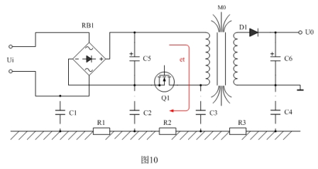 值得一提的是,开关电源变压器初级线圈的漏感产生的反电动势et,在所有干扰信号之中是最不容忽视的,如图10所示。当电源开关管关断的时候,开关电源变压器初级线圈的漏感产生的反电动势et几乎没有回路可释放,一方面,它只能通过初级线圈的分布电容进行充电,并让初级线圈的分布电容与漏感产生并联谐振;另一方面,它只能通过辐射向外进行释放,其中通过对地电容C3与大地相连,也是反电动势et释放能量的一个回路,因此,它对输入端也会产生共模信号干扰。