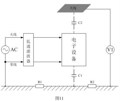 辐射干扰一般是通过电磁感应的形式在空间进行传播的,图11是测试电子设备产生辐射干扰的基本方法,或表示电子设备产生的干扰信号通过电磁感应向空中辐射的原理。图11中,电子设备表示干扰信号源,V1表示测量仪表,C1表示电子设备对大地的电容,C2表示电子设备与天线偶合的电容,即:电子设备通过电场对天线产生感应,这里的天线也可以看成是被干扰的设备。图11的测试方法就是测试电子设备周围规定距离某处的电磁场强度,由于干扰信号一般都是一个频率成份非常丰富的非正弦波,因此,无法对它进行直接测量,只能对它其中某一个频率信号单独进行测量。
