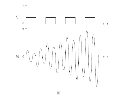 图13是谐振回路产生谐振的工作原理图。图13-a)是一个含有谐波分量非常丰富的电压方波,图13-b)是LC串联回路产生谐振时的电压波形。当电压方波作用于LC串联回路时,方波的前后沿都会对LC串联回路产生激励(即接收能量),每次激励过后又会产生阻尼振荡(即损耗能量),当输入电压波形的上升率dv/dt值大于谐振回路波形(正弦波)的上升率时,电路就会产生激励;当输入电压波形的上升率dv/dt值小于谐振回路波形的上升率时,电路就会产生阻尼。