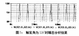 从上述分析可得出,通过改变触发脉冲的触发角可改变输出的电压。利用Pspice仿真可分析电路的一些性能。以达到设计的要求。
