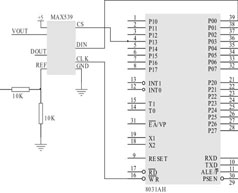 MAX1241的典型应用电路如图2所示。 MAX539是12位串行DA转换芯片,其使用方法与MAX1241大致相同,接口标准也符合SPI总线标准,MAX539的内部增益为2,因此其输入与输出的关系如下表所示,应用电路如图3所示。