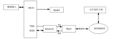 本系统的优势在于能使四表数据通过小区内局域网传输。其采用了***摩挲公司的串口上网接口设备Nport Express DE-311,它是一种单片机网络接入设备,有两个端口,一个是RS232或RS485电平的输入接口,另一个是网络接口,内部自动对数据进行TCP/IP封装,对用户来说是完全透明的,如图2所示。该设备在市面上已经非常普及。