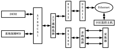 从上图中可以看出,抄表系统分三个层次,最上层为小区中央处理机,用来全面监控;中间层由小区内部局域网(以太网)构成,是数据传送的大通道;最底层为四表数据采集层,由RS485网络构成,完成四表的数据采集、集中并向上位机传送的功能。上层是利用VB语言设计的一个界面友善、操作方便的软件系统,用户只需要简单的按键操作就可以实现数据经网口进行远程收发。发送的命令,经内部局域网传送到远端的网口转串口设备。中层的集控器主要负责对命令识别并实现该命令的相关操作,如全抄表、单用户抄表和定时抄表命令。下达的命令经RS485总线网络传送给各个用户家中的采集器中,然后对脉冲表(如煤气表、水表、电表等)进行读取并存储,最后再经RS485总线上传。