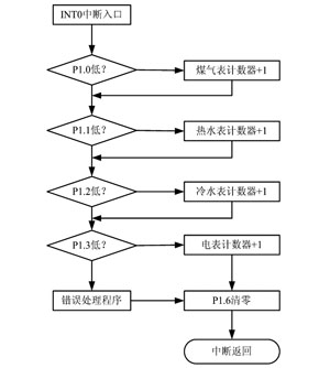 CD40174芯片的Q0~Q3分别接至AT89C51的P1.0~P1.3。同时,7411芯片产生的负脉冲信号送至单片机的INT0,以便有智能终端脉冲产生时,使CPU能产生中断,进行采集。对P1.0~P1.3进行循环查询,则可知采集的脉冲数来自哪个数字表,采集程序流程如图4所示。