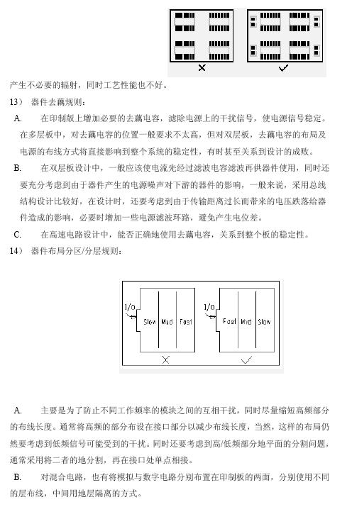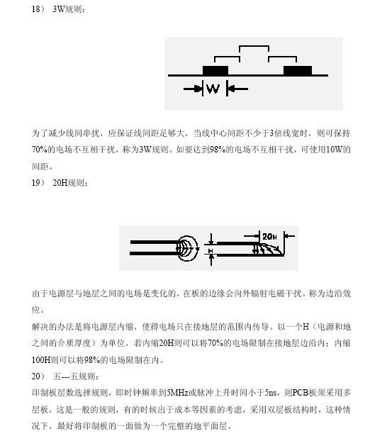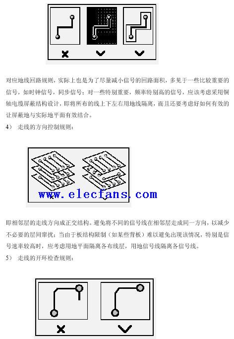 环路最小规则,即信号线与其回路构成的环面积要尽可能小,环面积越小,对外的辐射越少,接收外界的干扰也越小。针对这一规则,在地平面分割时,要考虑到地平面与重要信号走线的分布,防止由于地平面开槽等带来的问题;在双层板设计中,在为电源留下足够空间的情况下,应该将留下的部分用参考地填充,且增加一些必要的孔,将双面地信号有效连接起来,对一些关键信号尽量采用地线隔离,对一些频率较高的设计,需特别考虑其地平面信号回路问题,建议采用多层板为宜。