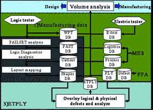 VYD核心引擎中的DB包括wafer lot、芯片名和坐标、已找到位置的线网名、线网形状、单元类型以及显示各诊断预报最高分的故障模型。制造DB包含测试条件、制造执行系统(MES)、物理故障分析(PFA)和将电气诊断(位图、逻辑线网诊断预报)与线路内PLY数据重叠的电气测试处理限定良品率(ETPLY)。