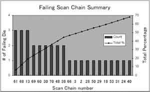 对ATE上出问题的扫描链的故障集进行分析,发现故障的原因。图4显示了扫描链,根据芯片的盘片样本数值,其故障数最高。