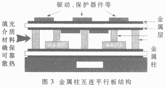 图3所示为金属柱互连平行板结构的封装示意图。在硅片的正反两面上下各有一层互相平行的陶瓷覆铜板(Direct Bond Copper--DBC)。DBC板上都预先刻蚀有相应的电路。硅片的底面直接焊接在DBC板上,而硅片正面的电极是通过直接键合的金属柱引出,与上DBC板构成电气连接,即借助金属柱完成了硅片之间及上下DBC板之间的互连。上DBC板作为一双面基板,安装驱动、保护等元件构成控制电路,与下DBC板的功率电路共同组成具备独立完整功能的集成电力电子模块。