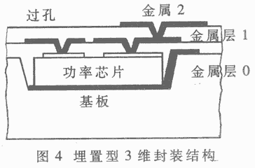以沉积金属膜为基础的互连工艺多采用埋置型三维封装结构,即在各类基板或介质中埋置裸芯片,顶层再贴装表贴元件及芯片来实现三维封装结构。典型结构如图4所示。其特点是蒸镀或溅射的金属膜不仅与芯片的电极相连,而且可以构成电路图形,并连至其他电路。
