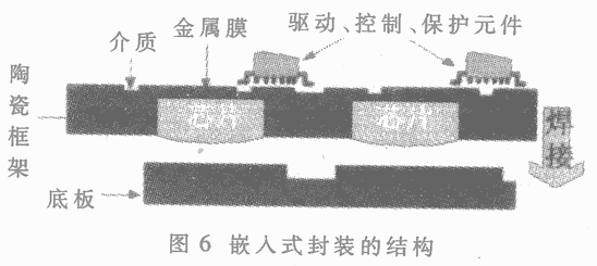 图6为嵌入式封装的结构示意图。首先在陶瓷框架上刻蚀出空洞,功率芯片被埋设在陶瓷框架的空洞内,之后,在其上部利用丝网漏印、光刻等技术分别涂覆介质薄膜以及金属膜并使之图形化,最后,集成模块的驱动、控制、保护元件以表贴或膜式元件的形式粘附在最上层。嵌入式封装结构的最大优点是可以大为缩小模块的体积,继而提高模块的功率密度。和焊接技术为基础的互连工艺相比,芯片电极引出线的距离更短,相应的寄生参数也更小。