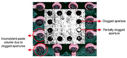 要检测小于12毫米的开孔口,模板需从背后照明并且每次测试 (0, 1 和 4 小时)时目检后印刷。图表1是通过10毫米孔的无铅焊膏印刷失败的示例,完全堵塞和部分堵塞的孔造成焊膏量不一致。
