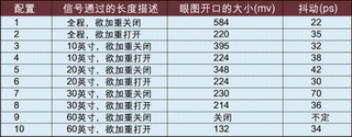 表1比较了2.5Gbps信号通过不同长度的差分互连线时,预加重器处于开/关两种状态下眼图窗口和抖动的差异。