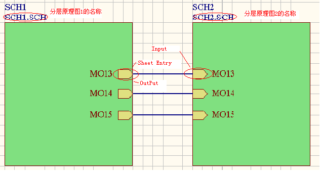 要创建的层次如上图所示,分别新建原理sch1.sch和sch2.sch.在原理图sch1.sch中放置PORT端口:M13,M14,M15(可以自定义),属性为OutPut.在原理图sch2.sch中放置PORT端口:M13,M14,M15(可以自定义),属性为InPut.