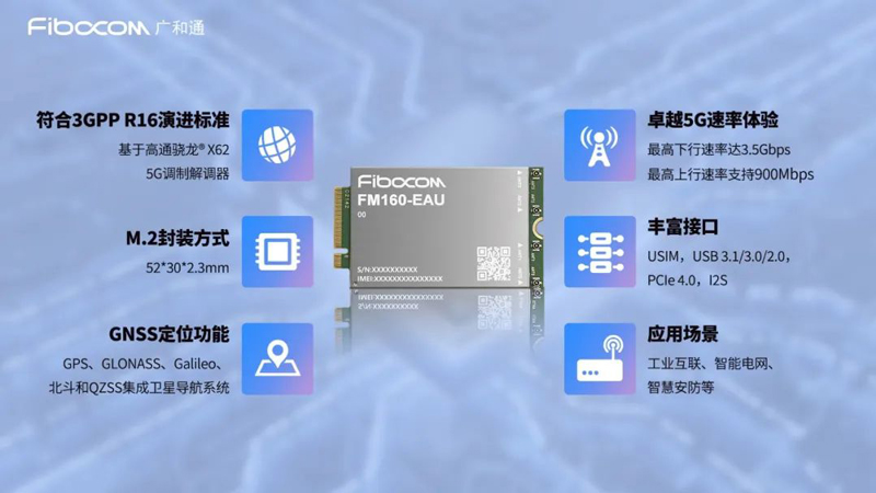 广和通FM160-EAU模组基于高通骁龙® X62 5G调制解调器,采用30x52x2.3mm的M.2标准封装方式,与广和通上一代的高通骁龙X55 5G 模组FM150兼容,便于客户开发终端设备。广和通FM160-EAU支持 5G 双载波聚合,最高可实现 120MHz 的频谱带宽,支持FDD+TDD混合双工,为行业用户带来更好的5G体验。在速率方面,FM160-EAU最高下行速率达3.5Gbps,最高上行速率可达900Mbps,进一步提升5G网络覆盖性、网络灵活性、网络容量,赋能卓越终端无线体验。