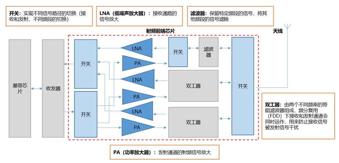 射频前端主要功能是将无线信号高频率转换到适合处理的中频范围或基带范围(原始频率范围),并进行信号放大、滤波、调制、解调和混频等处理。它起到将无线信号从天线接收或发送到信号处理部分的接口作用,承担着信号的转换和调理任务。