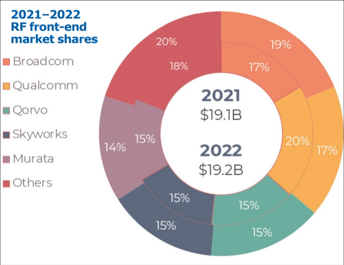 2021-2022年全球射频前端器件市场五大厂商就占比80%左右