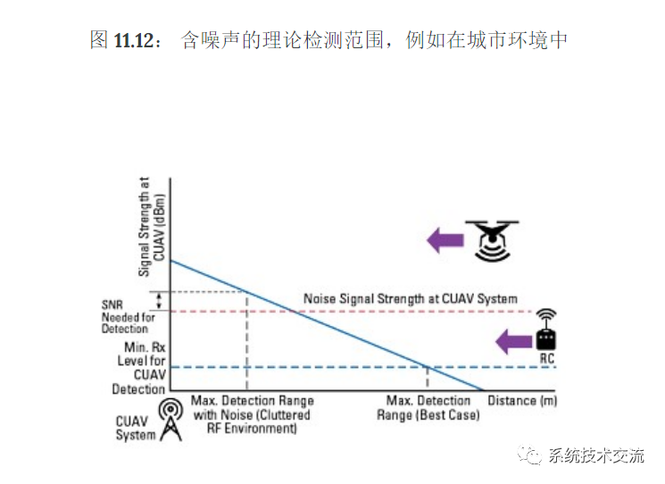 对于无人机检测,CUAV接收器处接收到的RC信号强度必须等于或大于接收器(Rx)灵敏度或最小信噪比(SNR),即最小电平。SNR取决于实际的RF环境,并且不断变化。例如,杂乱的RF环境会缩小检测范围。要对无人机类型进行分类,CUAV 接收器必须接收最低 Rx 电平。此最低电平特定于无人机的类型,取决于 RC 信号的 FHSS 调制和探测器感知的整体噪声。图11.11显示了噪声最小的环境中的最大检测范围。在城市等电磁噪声环境中,检测范围会大大缩小(见图11.12)。(梅瑟,2021)
